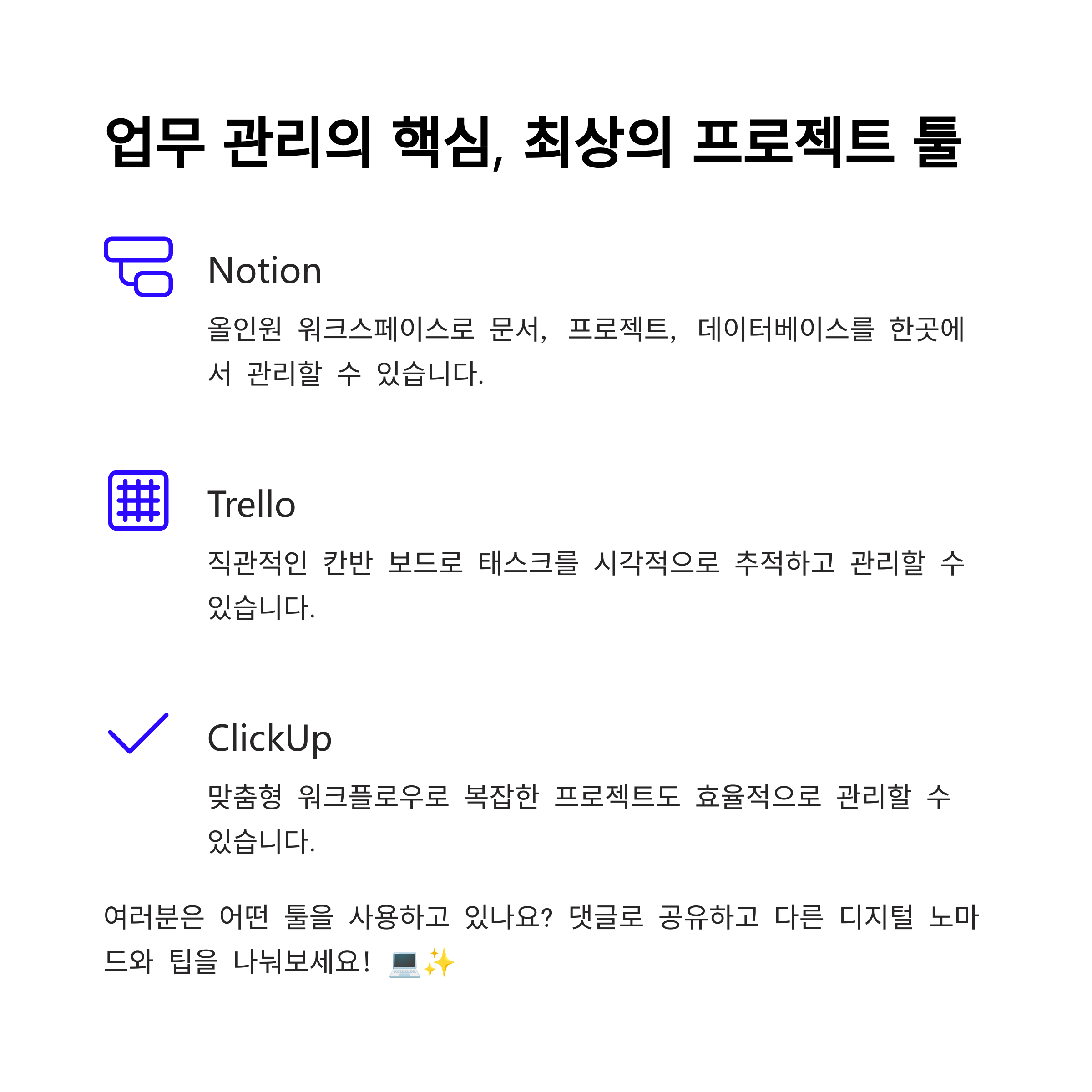 트렐로, 노션, 아사나 등은 직관적인 인터페이스와 협업 기능이 탁월하여