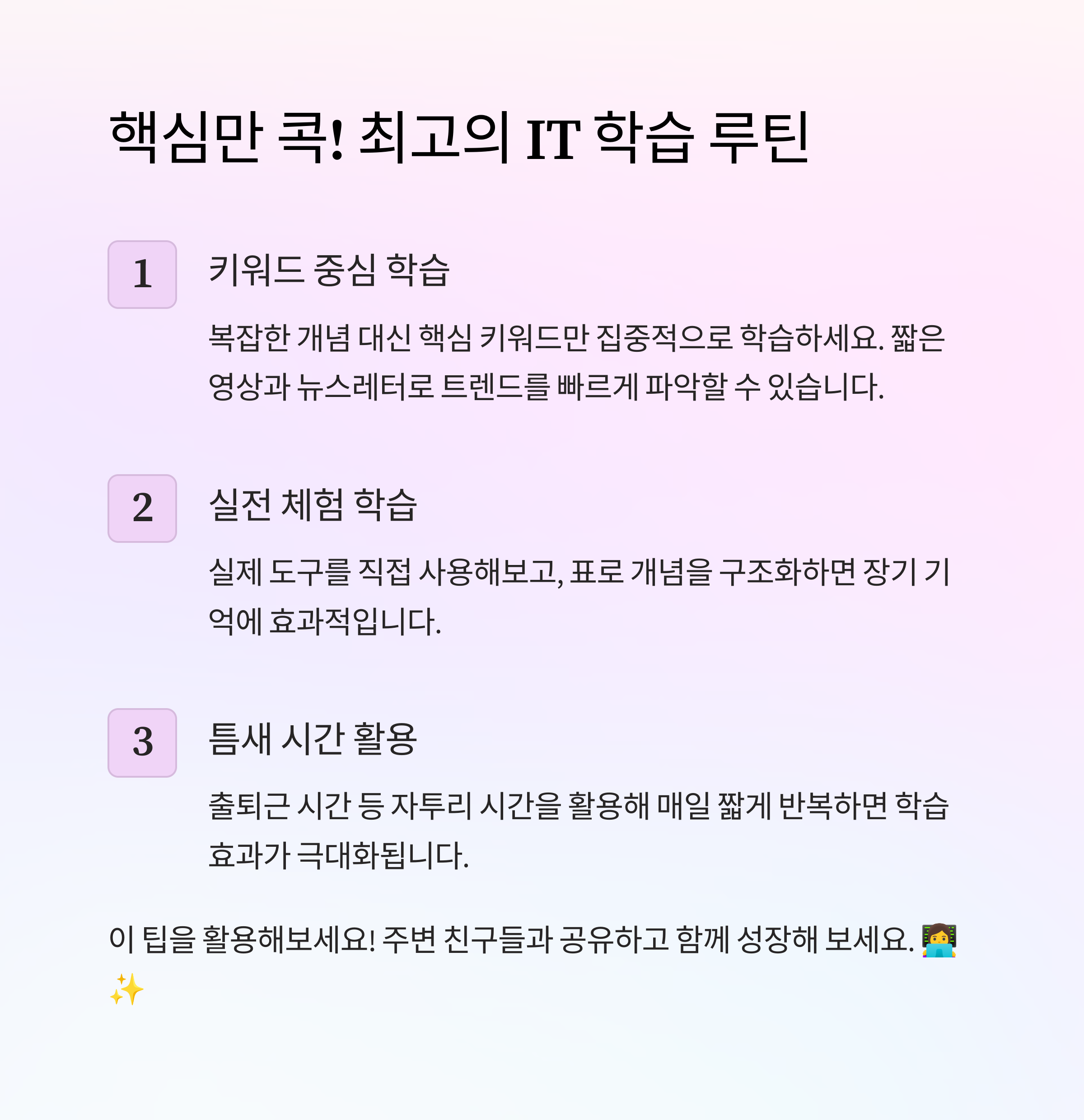 IT는 한 번에 몰아 배우기보다 매일 10분씩 자주 접하는 것이 중요합니다.