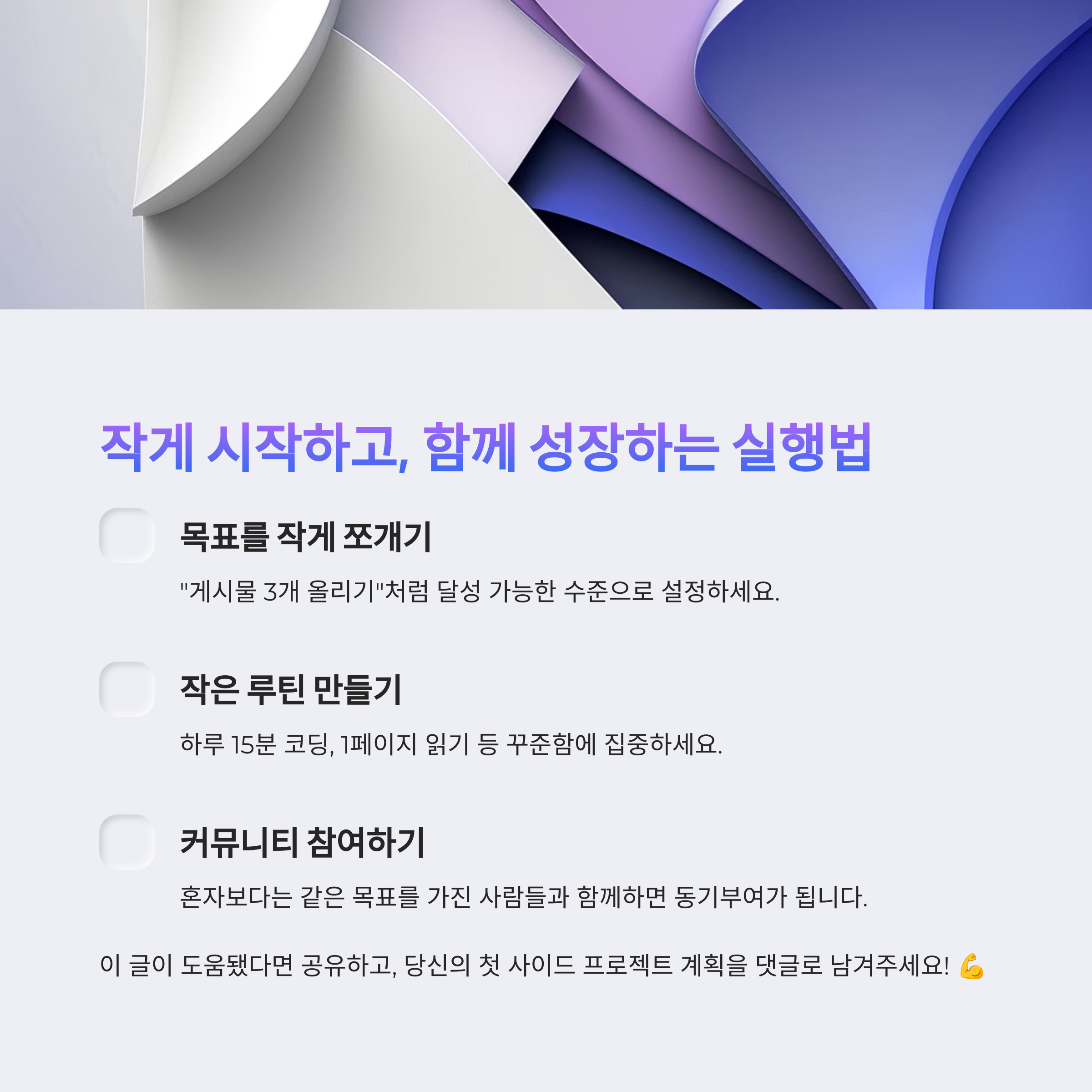 사이드 프로젝트는 결과보다 과정 중심이어야 한다는 인식이 중요합니다.