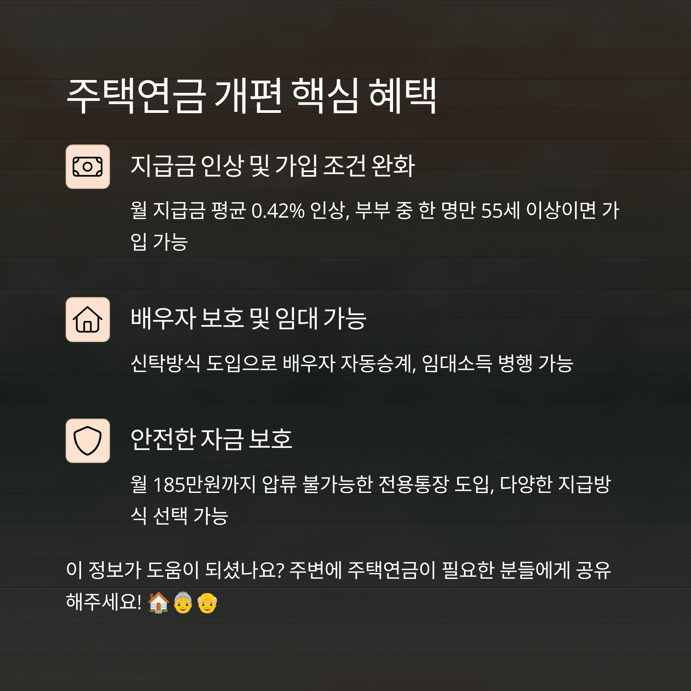 주택을 보유하고 있지만 생활비가 고민이라면, 이제는 연금 형태로 그 자산을 안전하게 활용할 수 있는 길이 열렸습니다. 보다 여유롭고 안정적인 노후를 꿈꾸는 분들께 이번 주택연금 제도는 분명 주목할 만한 기회입니다.