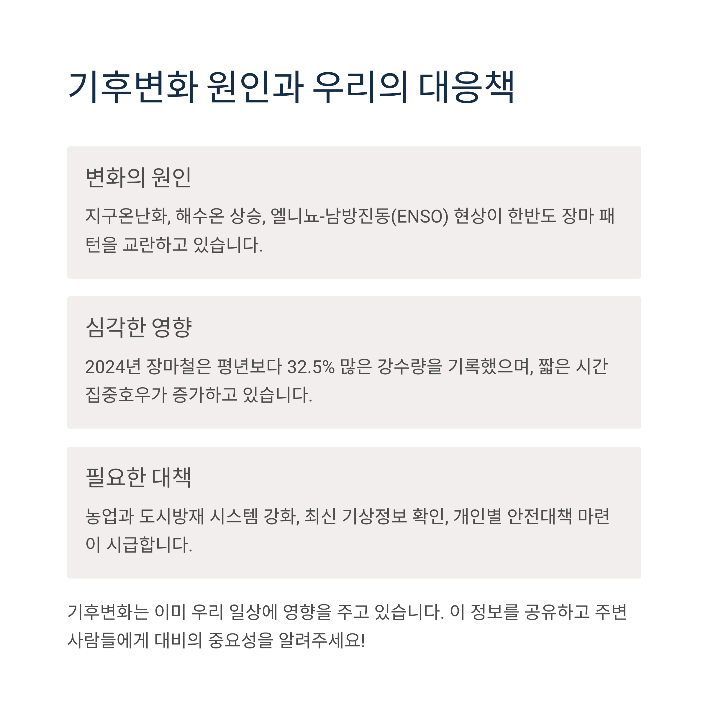 이제는 장마를 단순한 계절적 현상으로 여길 수 없는 시대입니다. 과거보다 예측이 어렵고 피해 규모가 커진 만큼, 기상정보에 대한 실시간 모니터링, 지역 맞춤형 재해 예방 계획, 그리고 국가 차원의 기후 대응 인프라 강화가 더욱 절실한 때입니다. 이상기후로 인한 장마의 변화는 우리 모두의 삶에 직결된 문제이므로, 관심과 대비가 필요합니다.