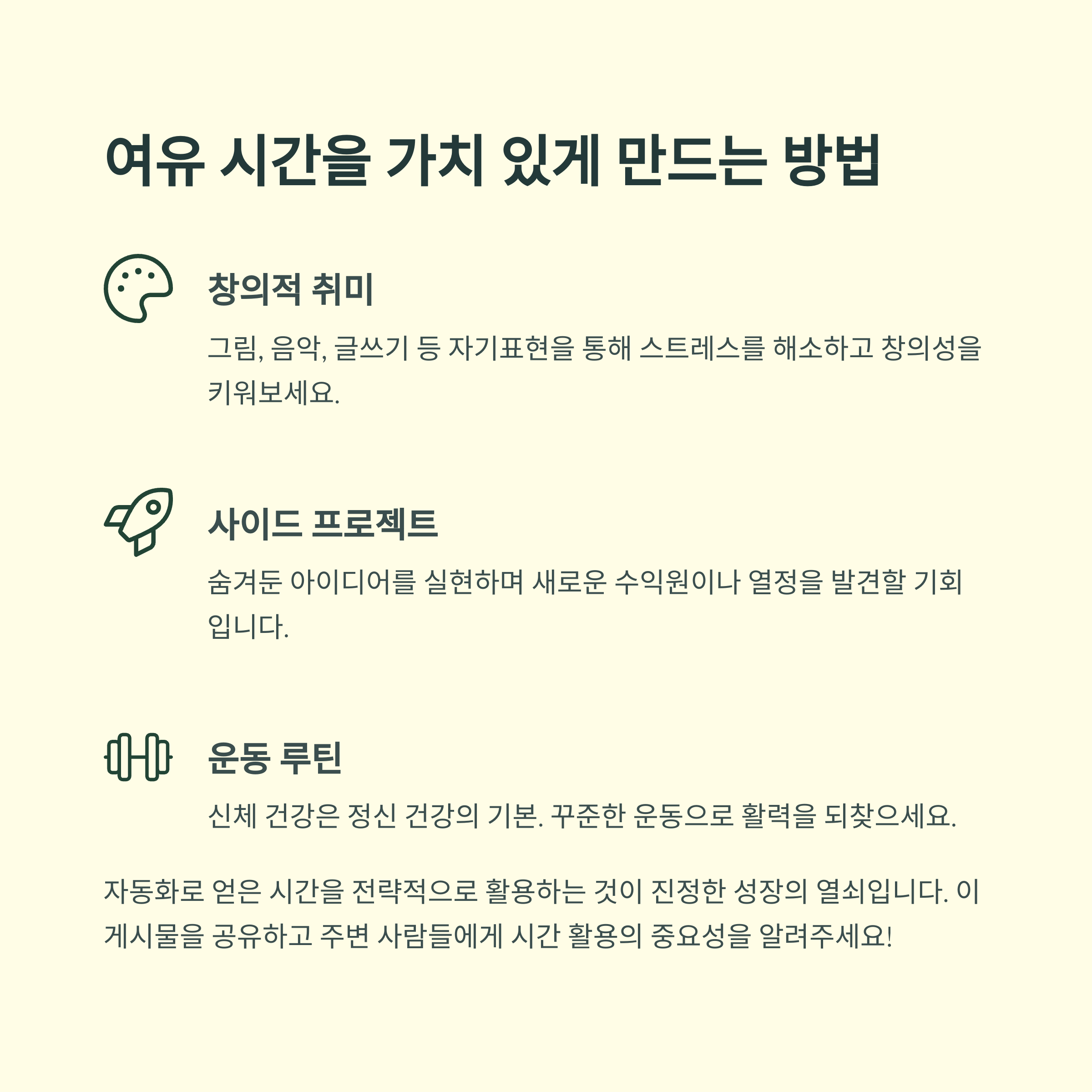 자동화 시스템이 일상과 업무 전반에 도입되면서 반복적인 작업에서 벗어나는 사람들이 늘고 있습니다. 이렇게 생긴 여유 시간은 단순한 쉼이 아닌 새로운 가능성의 시작입니다. 이번 글에서는 자동화 덕분에 확보한 시간으로 무엇을 할 수 있는지, 실제 생활에서 어떻게 활용하면 좋을지 구체적인 방안을 정리해 보았습니다.
